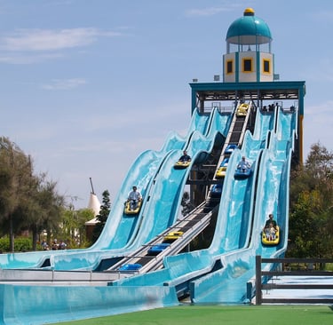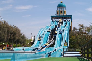 They have a large water park with slides, lazy river and rides, shows with animals and pirates, dry rides suitable for kids aged 1-13, 4D cinema, dinosaur boat ride and the big attraction, the Dolphin Show, which is actually very good... the dolphins hit balls in to the crowd so make sure your kids are ready to try and grab one to take home!